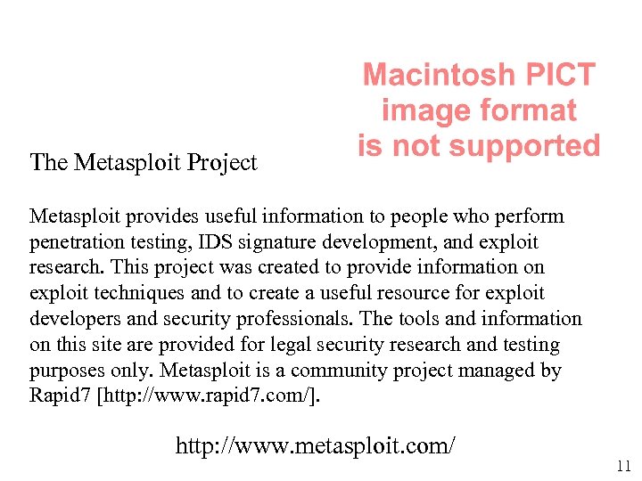 The Metasploit Project Metasploit provides useful information to people who perform penetration testing, IDS signature development, and exploit research. This project was created to provide information on exploit techniques and to create a useful resource for exploit developers and security professionals. The tools and information on this site are provided for legal security research and testing purposes only. Metasploit is a community project managed by Rapid 7 [http: //www. rapid 7. com/]. http: //www. metasploit. com/ 11