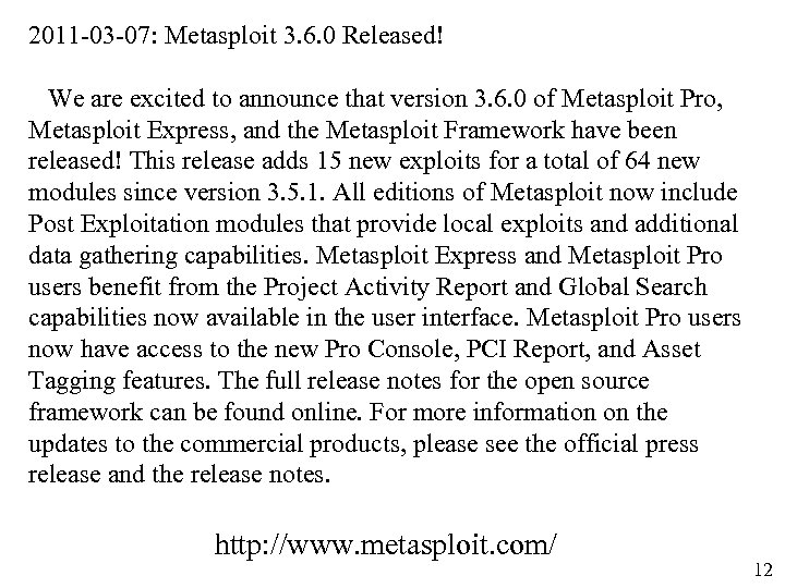 2011 -03 -07: Metasploit 3. 6. 0 Released! We are excited to announce that version 3. 6. 0 of Metasploit Pro, Metasploit Express, and the Metasploit Framework have been released! This release adds 15 new exploits for a total of 64 new modules since version 3. 5. 1. All editions of Metasploit now include Post Exploitation modules that provide local exploits and additional data gathering capabilities. Metasploit Express and Metasploit Pro users benefit from the Project Activity Report and Global Search capabilities now available in the user interface. Metasploit Pro users now have access to the new Pro Console, PCI Report, and Asset Tagging features. The full release notes for the open source framework can be found online. For more information on the updates to the commercial products, please see the official press release and the release notes. http: //www. metasploit. com/ 12