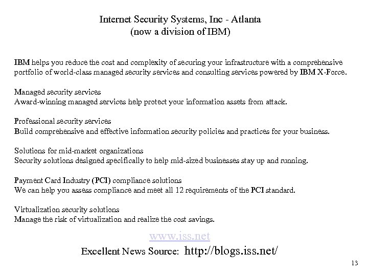 Internet Security Systems, Inc - Atlanta (now a division of IBM) IBM helps you reduce the cost and complexity of securing your infrastructure with a comprehensive portfolio of world-class managed security services and consulting services powered by IBM X-Force. Managed security services Award-winning managed services help protect your information assets from attack. Professional security services Build comprehensive and effective information security policies and practices for your business. Solutions for mid-market organizations Security solutions designed specifically to help mid-sized businesses stay up and running. Payment Card Industry (PCI) compliance solutions We can help you assess compliance and meet all 12 requirements of the PCI standard. Virtualization security solutions Manage the risk of virtualization and realize the cost savings. www. iss. net Excellent News Source: http: //blogs. iss. net/ 13