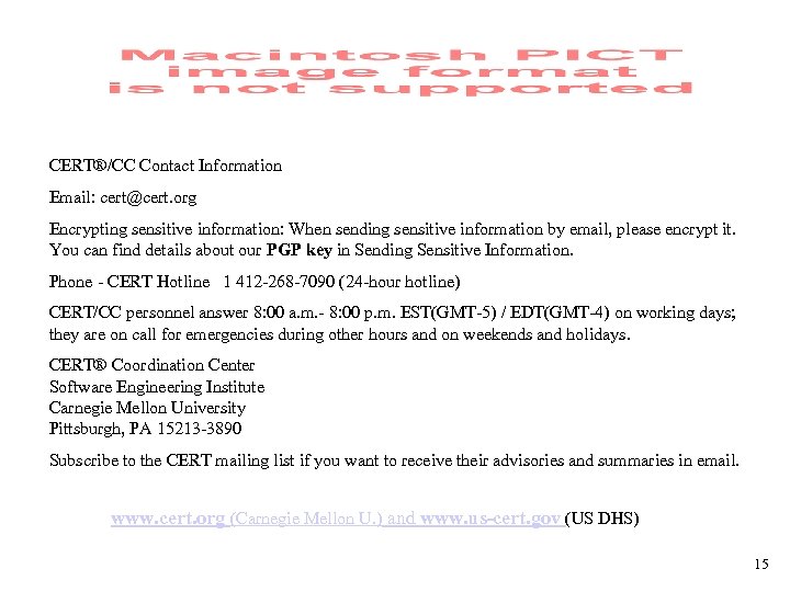 CERT®/CC Contact Information Email: cert@cert. org Encrypting sensitive information: When sending sensitive information by email, please encrypt it. You can find details about our PGP key in Sending Sensitive Information. Phone - CERT Hotline 1 412 -268 -7090 (24 -hour hotline) CERT/CC personnel answer 8: 00 a. m. - 8: 00 p. m. EST(GMT-5) / EDT(GMT-4) on working days; they are on call for emergencies during other hours and on weekends and holidays. CERT® Coordination Center Software Engineering Institute Carnegie Mellon University Pittsburgh, PA 15213 -3890 Subscribe to the CERT mailing list if you want to receive their advisories and summaries in email. www. cert. org (Carnegie Mellon U. ) and www. us-cert. gov (US DHS) 15