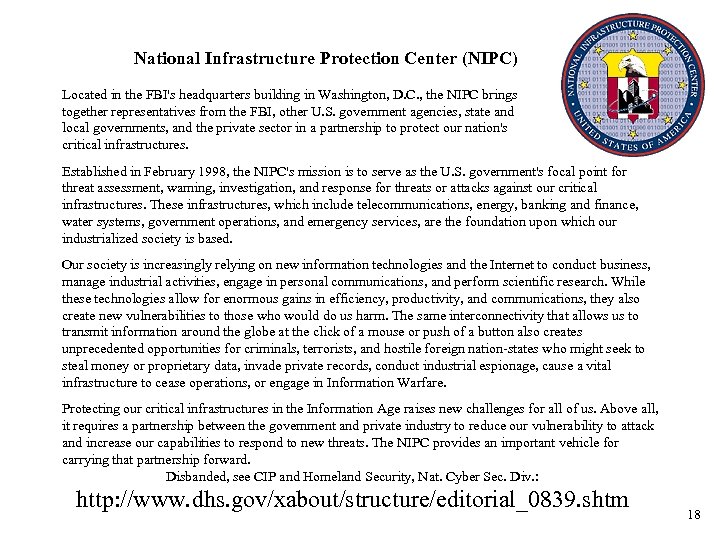 National Infrastructure Protection Center (NIPC) Located in the FBI's headquarters building in Washington, D. C. , the NIPC brings together representatives from the FBI, other U. S. government agencies, state and local governments, and the private sector in a partnership to protect our nation's critical infrastructures. Established in February 1998, the NIPC's mission is to serve as the U. S. government's focal point for threat assessment, warning, investigation, and response for threats or attacks against our critical infrastructures. These infrastructures, which include telecommunications, energy, banking and finance, water systems, government operations, and emergency services, are the foundation upon which our industrialized society is based. Our society is increasingly relying on new information technologies and the Internet to conduct business, manage industrial activities, engage in personal communications, and perform scientific research. While these technologies allow for enormous gains in efficiency, productivity, and communications, they also create new vulnerabilities to those who would do us harm. The same interconnectivity that allows us to transmit information around the globe at the click of a mouse or push of a button also creates unprecedented opportunities for criminals, terrorists, and hostile foreign nation-states who might seek to steal money or proprietary data, invade private records, conduct industrial espionage, cause a vital infrastructure to cease operations, or engage in Information Warfare. Protecting our critical infrastructures in the Information Age raises new challenges for all of us. Above all, it requires a partnership between the government and private industry to reduce our vulnerability to attack and increase our capabilities to respond to new threats. The NIPC provides an important vehicle for carrying that partnership forward. Disbanded, see CIP and Homeland Security, Nat. Cyber Sec. Div. : http: //www. dhs. gov/xabout/structure/editorial_0839. shtm 18