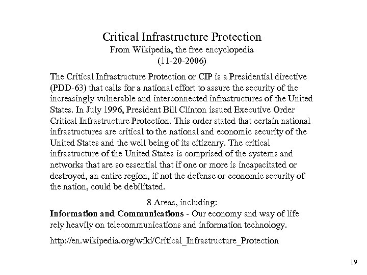 Critical Infrastructure Protection From Wikipedia, the free encyclopedia (11 -20 -2006) The Critical Infrastructure Protection or CIP is a Presidential directive (PDD-63) that calls for a national effort to assure the security of the increasingly vulnerable and interconnected infrastructures of the United States. In July 1996, President Bill Clinton issued Executive Order Critical Infrastructure Protection. This order stated that certain national infrastructures are critical to the national and economic security of the United States and the well being of its citizenry. The critical infrastructure of the United States is comprised of the systems and networks that are so essential that if one or more is incapacitated or destroyed, an entire region, if not the defense or economic security of the nation, could be debilitated. 8 Areas, including: Information and Communications - Our economy and way of life rely heavily on telecommunications and information technology. http: //en. wikipedia. org/wiki/Critical_Infrastructure_Protection 19
