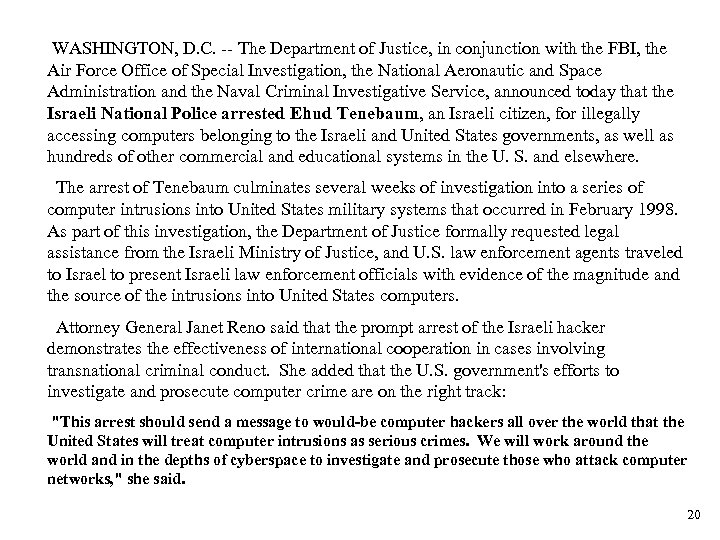 WASHINGTON, D. C. -- The Department of Justice, in conjunction with the FBI, the Air Force Office of Special Investigation, the National Aeronautic and Space Administration and the Naval Criminal Investigative Service, announced today that the Israeli National Police arrested Ehud Tenebaum, an Israeli citizen, for illegally accessing computers belonging to the Israeli and United States governments, as well as hundreds of other commercial and educational systems in the U. S. and elsewhere. The arrest of Tenebaum culminates several weeks of investigation into a series of computer intrusions into United States military systems that occurred in February 1998. As part of this investigation, the Department of Justice formally requested legal assistance from the Israeli Ministry of Justice, and U. S. law enforcement agents traveled to Israel to present Israeli law enforcement officials with evidence of the magnitude and the source of the intrusions into United States computers. Attorney General Janet Reno said that the prompt arrest of the Israeli hacker demonstrates the effectiveness of international cooperation in cases involving transnational criminal conduct. She added that the U. S. government's efforts to investigate and prosecute computer crime are on the right track: "This arrest should send a message to would-be computer hackers all over the world that the United States will treat computer intrusions as serious crimes. We will work around the world and in the depths of cyberspace to investigate and prosecute those who attack computer networks, " she said. 20