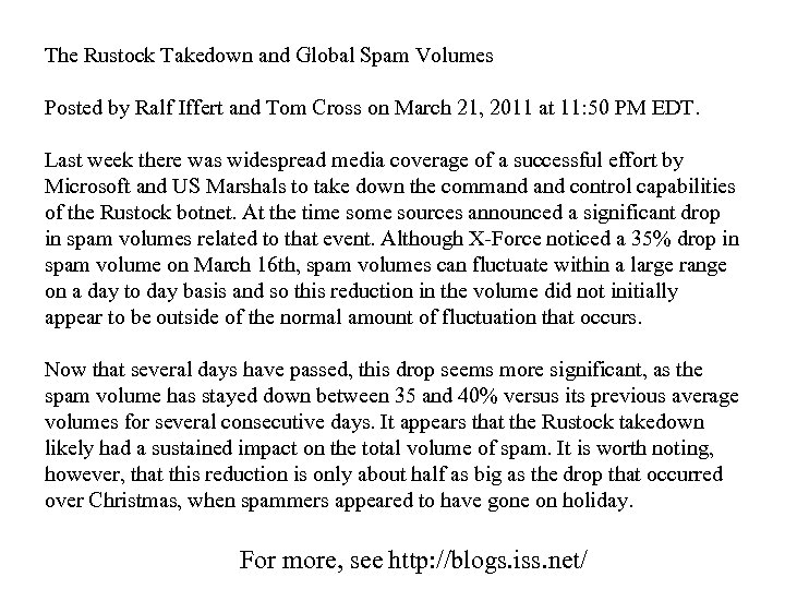 The Rustock Takedown and Global Spam Volumes Posted by Ralf Iffert and Tom Cross on March 21, 2011 at 11: 50 PM EDT. Last week there was widespread media coverage of a successful effort by Microsoft and US Marshals to take down the command control capabilities of the Rustock botnet. At the time sources announced a significant drop in spam volumes related to that event. Although X-Force noticed a 35% drop in spam volume on March 16 th, spam volumes can fluctuate within a large range on a day to day basis and so this reduction in the volume did not initially appear to be outside of the normal amount of fluctuation that occurs. Now that several days have passed, this drop seems more significant, as the spam volume has stayed down between 35 and 40% versus its previous average volumes for several consecutive days. It appears that the Rustock takedown likely had a sustained impact on the total volume of spam. It is worth noting, however, that this reduction is only about half as big as the drop that occurred over Christmas, when spammers appeared to have gone on holiday. For more, see http: //blogs. iss. net/
