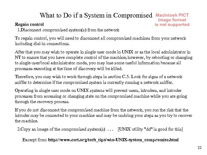 What to Do if a System in Compromised Regain control 1. Disconnect compromised system(s) from the network To regain control, you will need to disconnect all compromised machines from your network including dial-in connections. After that you may wish to operate in single user mode in UNIX or as the local administrator in NT to ensure that you have complete control of the machine; however, by rebooting or changing to single user/local administrator mode, you may lose some useful information because all processes executing at the time of discovery will be killed. Therefore, you may wish to work through steps in section C. 5. Look for signs of a network sniffer to determine if the compromised system is currently running a network sniffer. Operating in single user mode on UNIX systems will prevent users, intruders, and intruder processes from accessing or changing state on the compromised machine while you are going through the recovery process. If you do not disconnect the compromised machine from the network, you run the risk that the intruder may be connected to your machine and may be undoing your steps as you try to recover the machine. 2. Copy an image of the compromised system(s). . . [UNIX utility "dd" is good for this] Excerpt from http: //www. cert. org/tech_tips/win-UNIX-system_compromise. html 22