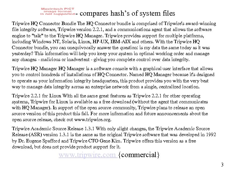Tripwire - compares hash’s of system files Tripwire HQ Connector Bundle The HQ Connector bundle is comprised of Tripwire's award-winning file integrity software, Tripwire version 2. 2. 1, and a communications agent that allows the software engine to "talk" to the Tripwire HQ Manager. Tripwire provides support for multiple platforms, including Windows NT, Solaris, Linux, HP-UX, IBM-AIX and others. With the Tripwire HQ Connector bundle, you can unequivocally answer the question: is my data the same today as it was yesterday? This information will help you keep your system in optimal working order and manage any changes - malicious or inadvertent - giving you complete control over data integrity. Tripwire HQ Manager is a software console with a graphical user interface that allows you to control hundreds of installations of HQ Connector. Named HQ Manager because it's designed to operate as your information integrity headquarters, this product provides you with the very best way to manage data integrity across an enterprise network from a single, centralized location. Tripwire 2. 2. 1 for Linux With all the same great features as Tripwire 2. 2. 1 for other operating systems, Tripwire for Linux is available as a free download (without the agent that communicates with HQ Manager). In support of the open source community, Tripwire plans to release an open source version of this product this fall. For more information and future announcements about the open source release, check out www. tripwire. org. Tripwire Academic Source Release 1. 3. 1 With only slight changes, the Tripwire Academic Source Release (ASR) version 1. 3. 1 is the same as the original Tripwire software that was developed in 1992 by Dr. Eugene Spafford and Tripwire CTO Gene Kim. Tripwire offers this version as a free download, but does not provide product support for it. www. tripwire. com {commercial} 3