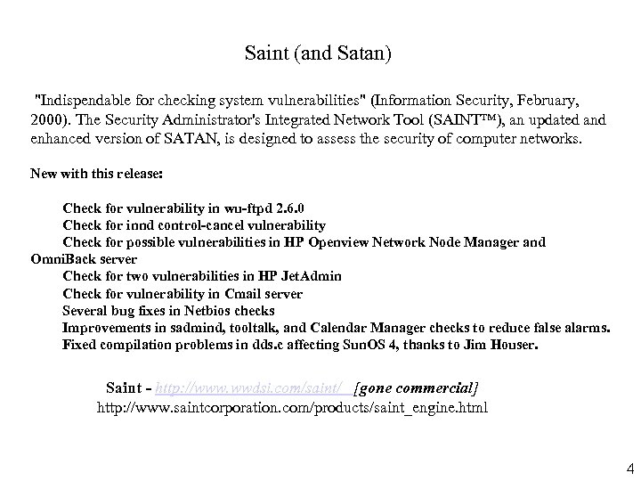 Saint (and Satan) "Indispendable for checking system vulnerabilities" (Information Security, February, 2000). The Security Administrator's Integrated Network Tool (SAINT™), an updated and enhanced version of SATAN, is designed to assess the security of computer networks. New with this release: Check for vulnerability in wu-ftpd 2. 6. 0 Check for innd control-cancel vulnerability Check for possible vulnerabilities in HP Openview Network Node Manager and Omni. Back server Check for two vulnerabilities in HP Jet. Admin Check for vulnerability in Cmail server Several bug fixes in Netbios checks Improvements in sadmind, tooltalk, and Calendar Manager checks to reduce false alarms. Fixed compilation problems in dds. c affecting Sun. OS 4, thanks to Jim Houser. Saint - http: //www. wwdsi. com/saint/ [gone commercial] http: //www. saintcorporation. com/products/saint_engine. html 4