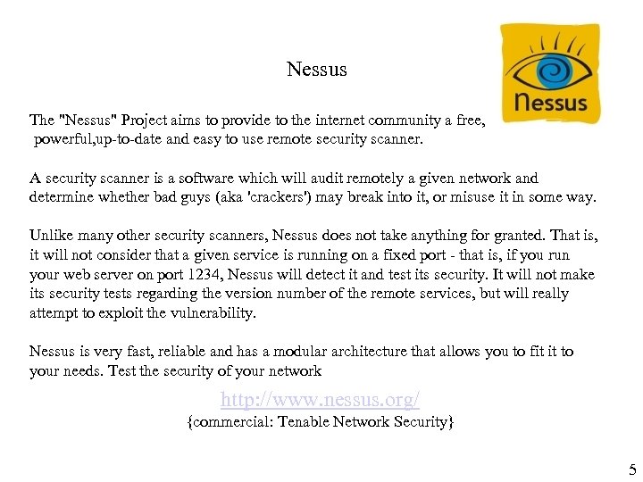 Nessus The "Nessus" Project aims to provide to the internet community a free, powerful, up-to-date and easy to use remote security scanner. A security scanner is a software which will audit remotely a given network and determine whether bad guys (aka 'crackers') may break into it, or misuse it in some way. Unlike many other security scanners, Nessus does not take anything for granted. That is, it will not consider that a given service is running on a fixed port - that is, if you run your web server on port 1234, Nessus will detect it and test its security. It will not make its security tests regarding the version number of the remote services, but will really attempt to exploit the vulnerability. Nessus is very fast, reliable and has a modular architecture that allows you to fit it to your needs. Test the security of your network http: //www. nessus. org/ {commercial: Tenable Network Security} 5