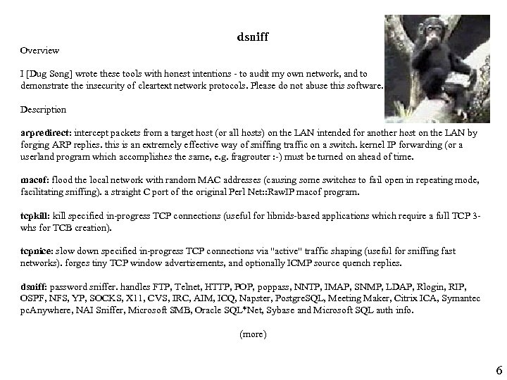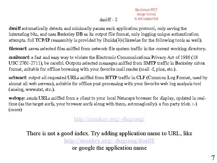 dsniff - 2 dsniff automatically detects and minimally parses each application protocol, only saving the interesting bits, and uses Berkeley DB as its output file format, only logging unique authentication attempts. full TCP/IP reassembly is provided by libnids(3) (likewise for the following tools as well). filesnarf: saves selected files sniffed from network file system traffic in the current working directory. mailsnarf: a fast and easy way to violate the Electronic Communications Privacy Act of 1986 (18 USC 2701 -2711), be careful. Outputs selected messages sniffed from SMTP traffic in Berkeley mbox format, suitable for offline browsing with your favorite mail reader (mail -f, pine, etc. ). urlsnarf: output all requested URLs sniffed from HTTP traffic in CLF (Common Log Format, used by almost all web servers), suitable for offline post-processing with your favorite web log analysis tool (analog, wwwstat, etc. ). webspy: sends URLs sniffed from a client to your local Netscape browser for display, updated in realtime (as the target surfs, your browser surfs along with them, automagically). a fun party trick. : -) (more) http: //monkey. org/~dugsong/ There is not a good index. Try adding application name to URL, like http: //monkey. org/~dugsong/dsniff/ or google the application name 7
