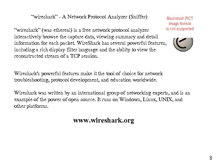 “wireshark” - A Network Protocol Analyzer (Sniffer) “wireshark” (was ethereal) is a free network protocol analyzer interactively browse the capture data, viewing summary and detail information for each packet. Wire. Shark has several powerful features, including a rich display filter language and the ability to view the reconstructed stream of a TCP session. Wireshark's powerful features make it the tool of choice for network troubleshooting, protocol development, and education worldwide. Wireshark was written by an international group of networking experts, and is an example of the power of open source. It runs on Windows, Linux, UNIX, and other platforms. www. wireshark. org 8