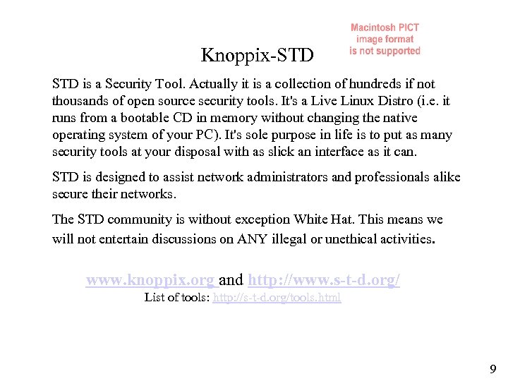 Knoppix-STD is a Security Tool. Actually it is a collection of hundreds if not thousands of open source security tools. It's a Live Linux Distro (i. e. it runs from a bootable CD in memory without changing the native operating system of your PC). It's sole purpose in life is to put as many security tools at your disposal with as slick an interface as it can. STD is designed to assist network administrators and professionals alike secure their networks. The STD community is without exception White Hat. This means we will not entertain discussions on ANY illegal or unethical activities. www. knoppix. org and http: //www. s-t-d. org/ List of tools: http: //s-t-d. org/tools. html 9
