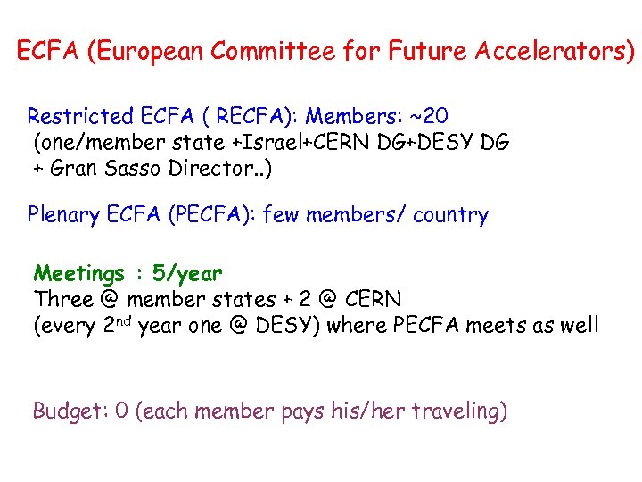 ECFA (European Committee for Future Accelerators) Restricted ECFA ( RECFA): Members: ~20 (one/member state +Israel+CERN DG+DESY DG + Gran Sasso Director. . ) Plenary ECFA (PECFA): few members/ country Meetings : 5/year Three @ member states + 2 @ CERN (every 2 nd year one @ DESY) where PECFA meets as well Budget: 0 (each member pays his/her traveling)
