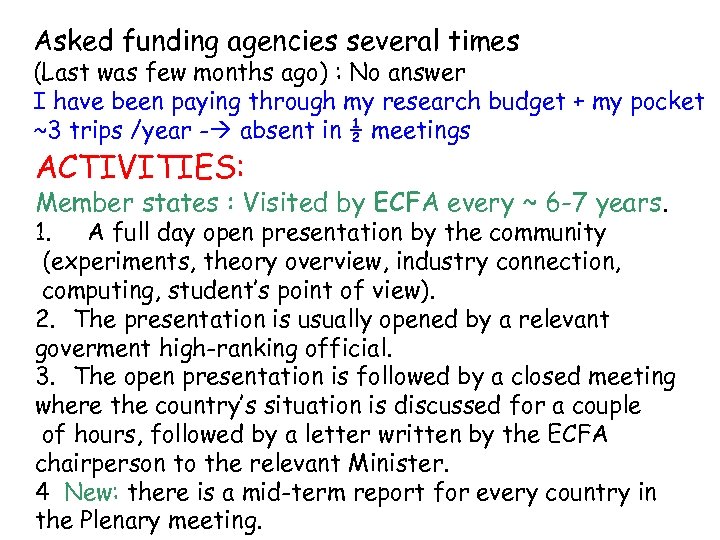Asked funding agencies several times (Last was few months ago) : No answer I have been paying through my research budget + my pocket ~3 trips /year - absent in ½ meetings ACTIVITIES: Member states : Visited by ECFA every ~ 6 -7 years. 1. A full day open presentation by the community (experiments, theory overview, industry connection, computing, student’s point of view). 2. The presentation is usually opened by a relevant goverment high-ranking official. 3. The open presentation is followed by a closed meeting where the country’s situation is discussed for a couple of hours, followed by a letter written by the ECFA chairperson to the relevant Minister. 4 New: there is a mid-term report for every country in the Plenary meeting.