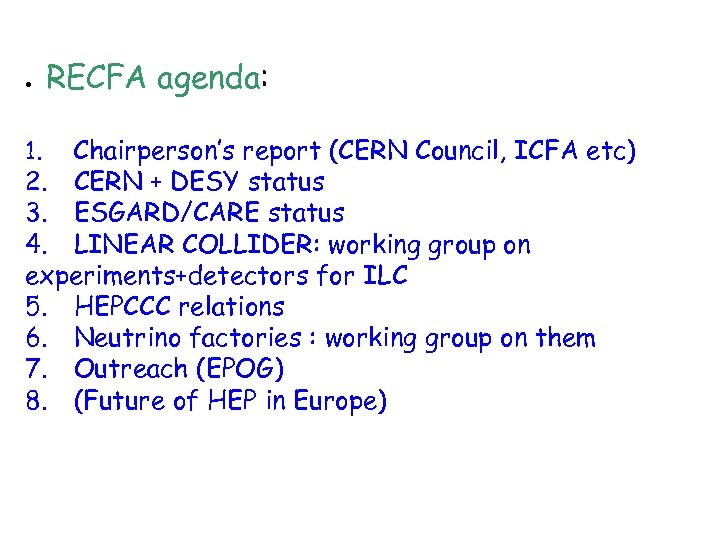 · RECFA agenda: 1. Chairperson’s report (CERN Council, ICFA etc) 2. CERN + DESY status 3. ESGARD/CARE status 4. LINEAR COLLIDER: working group on experiments+detectors for ILC 5. HEPCCC relations 6. Neutrino factories : working group on them 7. Outreach (EPOG) 8. (Future of HEP in Europe)