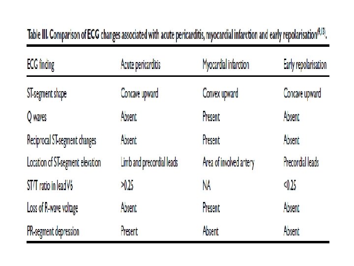 . • O/E pericardial friction rub is a pathognomic finding, best heard in expiration, heard 50% of times • Distinct ECG findings: • i) Concave ST elevation • ii) PR seg depression • iii) widespread STE not corresponding to any arterial territory • iv) Absence of reciprocal changes and Q waves • v) Possible presecnce of low voltages • (STE II>STE III strongly favours acute pericarditis; STE III>STE II strongly favours AMI