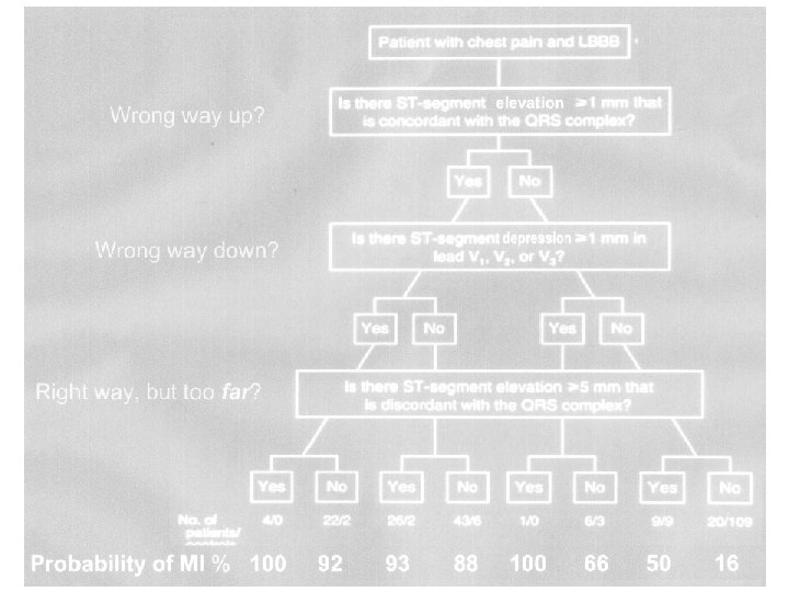 Sgarbossa criteria • LBB on ECG may mask changes of AMI • Can delay reognition of AMI and thrombolysis • Sgarbossa et al tested criteria for AMI in presence of LBBB • Data used from patients enrolled on GUSTO-1 trial • These patients had AMI confirmed by enzyme studies