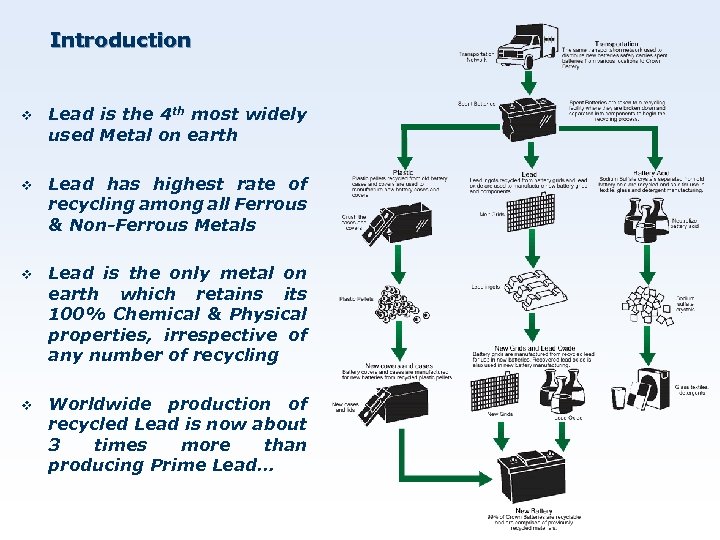 Introduction v Lead is the 4 th most widely used Metal on earth v Lead has highest rate of recycling among all Ferrous & Non-Ferrous Metals v Lead is the only metal on earth which retains its 100% Chemical & Physical properties, irrespective of any number of recycling v Worldwide production of recycled Lead is now about 3 times more than producing Prime Lead…