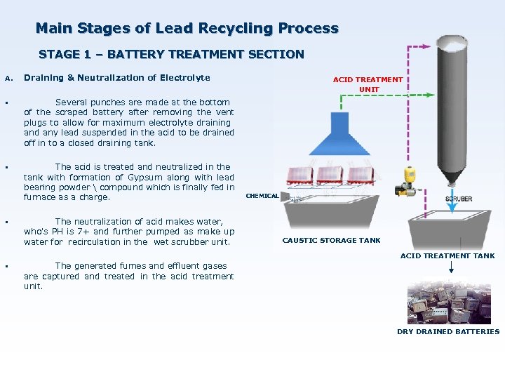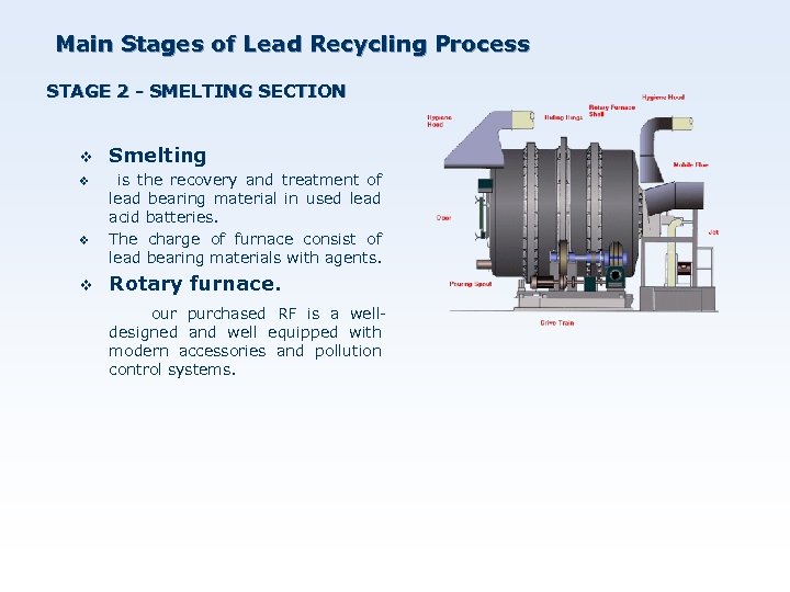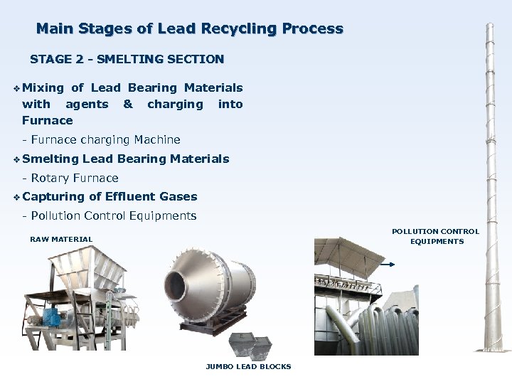 Main Stages of Lead Recycling Process STAGE 2 - SMELTING SECTION v v v Smelting is the recovery and treatment of lead bearing material in used lead acid batteries. The charge of furnace consist of lead bearing materials with agents. Rotary furnace. our purchased RF is a wellv designed and well equipped with modern accessories and pollution control systems.