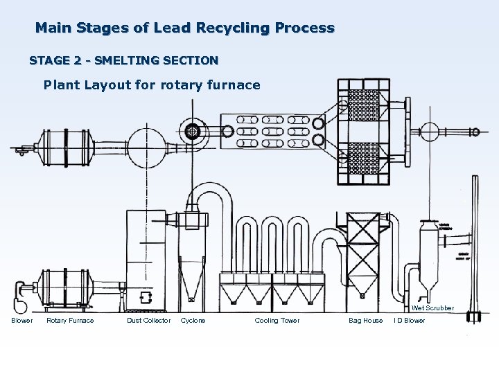Main Stages of Lead Recycling Process STAGE 2 - SMELTING SECTION Plant Layout for rotary furnace Wet Scrubber Blower Rotary Furnace Dust Collector Cyclone Cooling Tower Bag House I D Blower