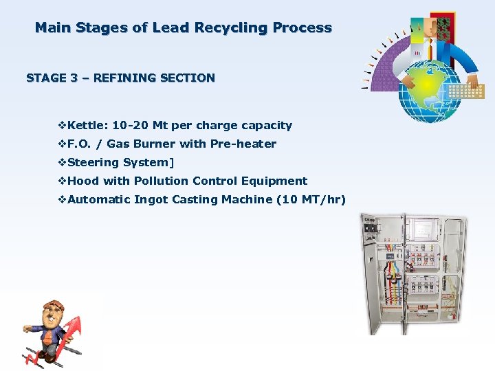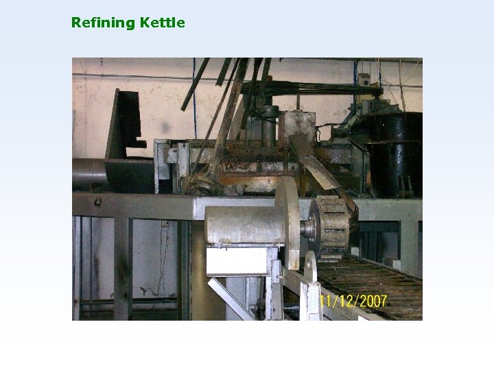 Main Stages of Lead Recycling Process STAGE 3 – REFINING SECTION v. Kettle: 10 -20 Mt per charge capacity v. F. O. / Gas Burner with Pre-heater v. Steering System] v. Hood with Pollution Control Equipment v. Automatic Ingot Casting Machine (10 MT/hr)