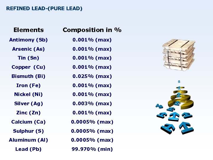 REFINED LEAD-(PURE LEAD) Elements Composition in % Antimony (Sb) 0. 001% (max) Arsenic (As) 0. 001% (max) Tin (Sn) 0. 001% (max) Copper (Cu) 0. 001% (max) Bismuth (Bi) 0. 025% (max) Iron (Fe) 0. 001% (max) Nickel (Ni) 0. 001% (max) Silver (Ag) 0. 003% (max) Zinc (Zn) 0. 001% (max) Calcium (Ca) 0. 0005% (max) Sulphur (S) 0. 0005% (max) Aluminum (Al) 0. 0005% (max) Lead (Pb) 99. 970% (min)