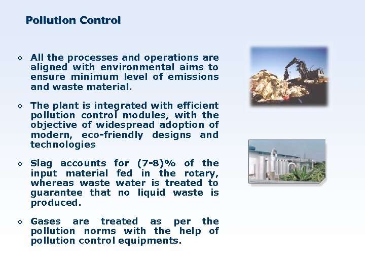 Pollution Control v All the processes and operations are aligned with environmental aims to ensure minimum level of emissions and waste material. v The plant is integrated with efficient pollution control modules, with the objective of widespread adoption of modern, eco-friendly designs and technologies v Slag accounts for (7 -8)% of the input material fed in the rotary, whereas waste water is treated to guarantee that no liquid waste is produced. v Gases are treated as per the pollution norms with the help of pollution control equipments.