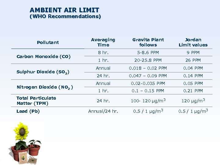 AMBIENT AIR LIMIT (WHO Recommendations) Pollutant Carbon Monoxide (CO) Sulphur Dioxide (SO 2) Nitrogen Dioxide (NO 2 ) Total Particulate Matter (TPM) Lead (Pb) Averaging Time Gravita Plant follows Jordan Limit values 8 hr. 5 -8. 6 PPM 9 PPM 1 hr. 20 -25. 8 PPM 26 PPM Annual 0. 018 – 0. 02 PPM 0. 04 PPM 24 hr. 0. 047 – 0. 09 PPM 0. 14 PPM Annual 0. 02 -0. 035 PPM 0. 05 PPM 1 hr. 0. 1 – 0. 15 PPM 0. 21 PPM 24 hr. 100 - 120 µg/m 3 Annual/24 hr. 0. 5 / 1 µg/m 3