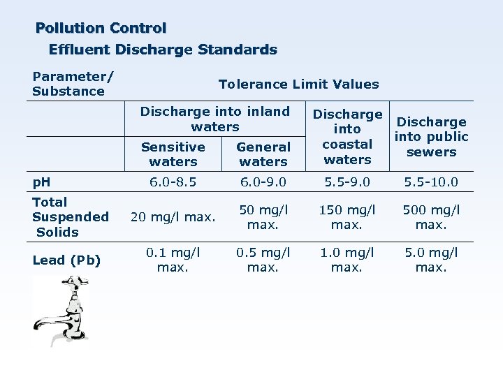 Pollution Control Effluent Discharge Standards Parameter/ Substance Tolerance Limit Values Discharge into inland waters Discharge into public coastal sewers waters Sensitive waters p. H Total Suspended Solids Lead (Pb) General waters 6. 0 -8. 5 6. 0 -9. 0 5. 5 -10. 0 20 mg/l max. 50 mg/l max. 150 mg/l max. 500 mg/l max. 0. 1 mg/l max. 0. 5 mg/l max. 1. 0 mg/l max. 5. 0 mg/l max.