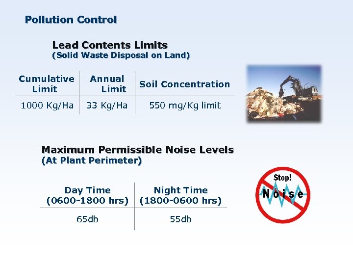 Pollution Control Lead Contents Limits (Solid Waste Disposal on Land) Cumulative Limit Annual Limit Soil Concentration 1000 Kg/Ha 33 Kg/Ha 550 mg/Kg limit Maximum Permissible Noise Levels (At Plant Perimeter) Day Time (0600 -1800 hrs) Night Time (1800 -0600 hrs) 65 db 55 db