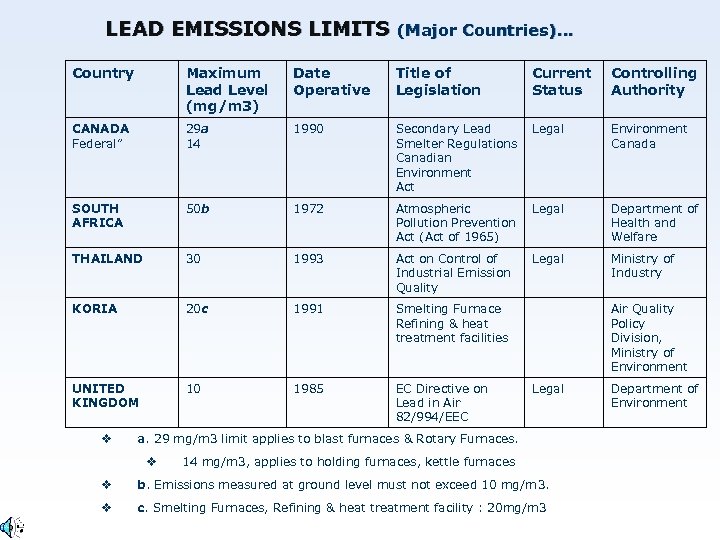 LEAD EMISSIONS LIMITS (Major Countries)… Country Maximum Lead Level (mg/m 3) Date Operative Title of Legislation Current Status Controlling Authority CANADA Federal” 29 a 14 1990 Secondary Lead Smelter Regulations Canadian Environment Act Legal Environment Canada SOUTH AFRICA 50 b 1972 Atmospheric Pollution Prevention Act (Act of 1965) Legal Department of Health and Welfare THAILAND 30 1993 Act on Control of Industrial Emission Quality Legal Ministry of Industry KORIA 20 c 1991 Smelting Furnace Refining & heat treatment facilities UNITED KINGDOM 10 1985 EC Directive on Lead in Air 82/994/EEC v Air Quality Policy Division, Ministry of Environment Legal a. 29 mg/m 3 limit applies to blast furnaces & Rotary Furnaces. v 14 mg/m 3, applies to holding furnaces, kettle furnaces v b. Emissions measured at ground level must not exceed 10 mg/m 3. v c. Smelting Furnaces, Refining & heat treatment facility : 20 mg/m 3 Department of Environment