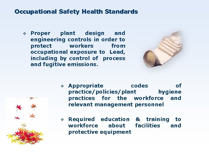 Occupational Safety Health Standards v Proper plant design and engineering controls in order to protect workers from occupational exposure to Lead, including by control of process and fugitive emissions. v Appropriate codes of practice/policies/plant hygiene practices for the workforce and relevant management personnel v Required education & training to workforce about facilities and protective equipment