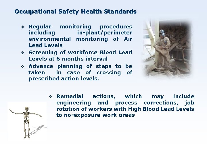 Occupational Safety Health Standards v v v Regular monitoring procedures including in-plant/perimeter environmental monitoring of Air Lead Levels Screening of workforce Blood Lead Levels at 6 months interval Advance planning of steps to be taken in case of crossing of prescribed action levels. v Remedial actions, which may include engineering and process corrections, job rotation of workers with High Blood Lead Levels to no-exposure work areas