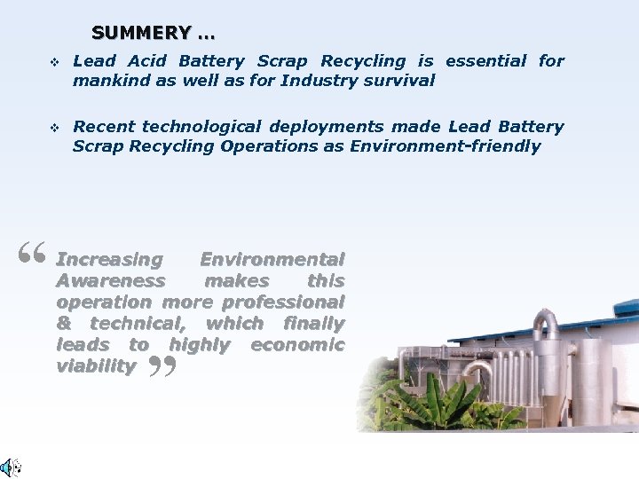SUMMERY … v v “ Lead Acid Battery Scrap Recycling is essential for mankind as well as for Industry survival Recent technological deployments made Lead Battery Scrap Recycling Operations as Environment-friendly Increasing Environmental Awareness makes this operation more professional & technical, which finally leads to highly economic viability ”