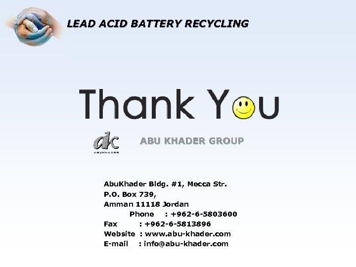 LEAD ACID BATTERY RECYCLING ABU KHADER GROUP Abu. Khader Bldg. #1, Mecca Str. P. O. Box 739, Amman 11118 Jordan Phone : +962 -6 -5803600 Fax : +962 -6 -5813896 Website : www. abu-khader. com E-mail : info@abu-khader. com