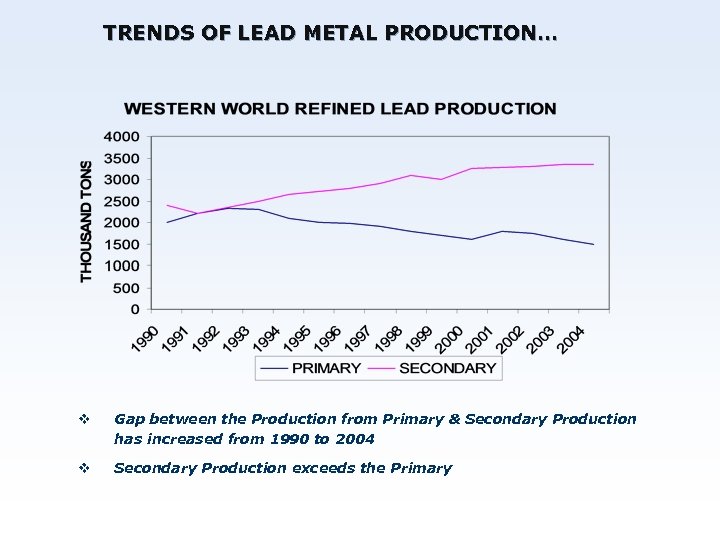 TRENDS OF LEAD METAL PRODUCTION… v Gap between the Production from Primary & Secondary Production has increased from 1990 to 2004 v Secondary Production exceeds the Primary