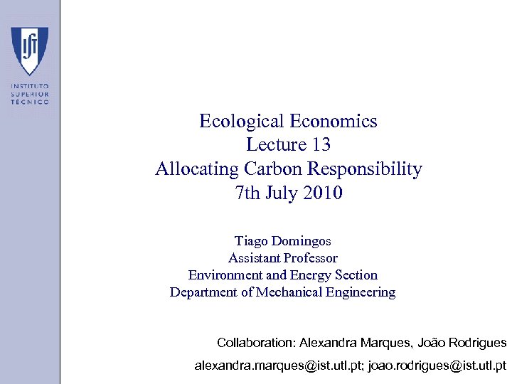 Ecological Economics Lecture 13 Allocating Carbon Responsibility 7 th July 2010 Tiago Domingos Assistant Professor Environment and Energy Section Department of Mechanical Engineering Collaboration: Alexandra Marques, João Rodrigues alexandra. marques@ist. utl. pt; joao. rodrigues@ist. utl. pt