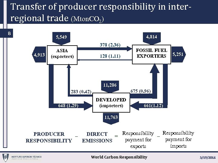 Transfer of producer responsibility in interregional trade (Mton. CO 2) 8 4, 814 5, 549 378 (2. 36) 4, 913 ASIA (exporters) 128 (1. 11) FOSSIL FUEL EXPORTERS 5, 251 11, 286 675 (0. 96) 283 (0. 42) 648 (1. 29) DEVELOPED (importers) 661(1. 12) 11, 763 _ PRODUCER DIRECT = Responsibility _ Responsibility payment for RESPONSIBILITY EMISSIONS imports exports World Carbon Responsibility 3/19/2018