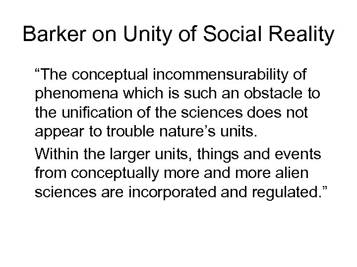 Barker on Unity of Social Reality “The conceptual incommensurability of phenomena which is such an obstacle to the unification of the sciences does not appear to trouble nature’s units. Within the larger units, things and events from conceptually more and more alien sciences are incorporated and regulated. ”
