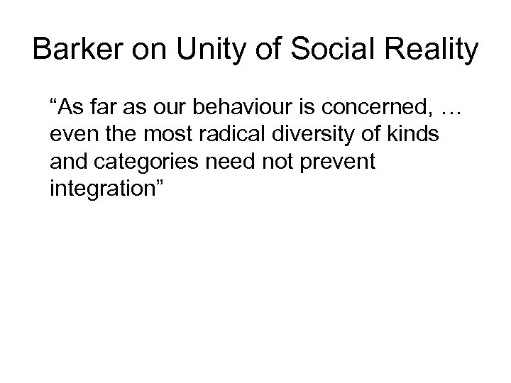 Barker on Unity of Social Reality “As far as our behaviour is concerned, … even the most radical diversity of kinds and categories need not prevent integration”