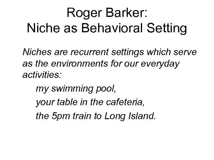 Roger Barker: Niche as Behavioral Setting Niches are recurrent settings which serve as the environments for our everyday activities: my swimming pool, your table in the cafeteria, the 5 pm train to Long Island.