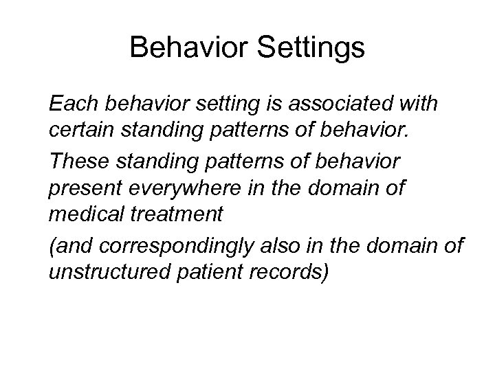 Behavior Settings Each behavior setting is associated with certain standing patterns of behavior. These standing patterns of behavior present everywhere in the domain of medical treatment (and correspondingly also in the domain of unstructured patient records)