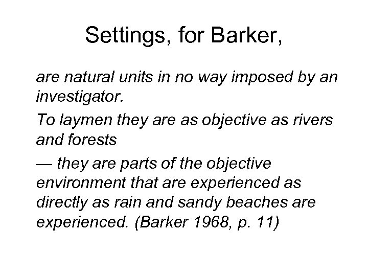 Settings, for Barker, are natural units in no way imposed by an investigator. To laymen they are as objective as rivers and forests — they are parts of the objective environment that are experienced as directly as rain and sandy beaches are experienced. (Barker 1968, p. 11)
