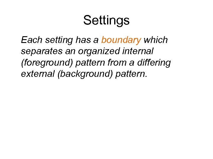 Settings Each setting has a boundary which separates an organized internal (foreground) pattern from a differing external (background) pattern.