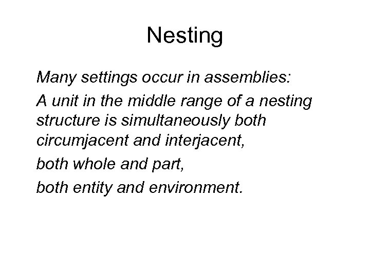 Nesting Many settings occur in assemblies: A unit in the middle range of a nesting structure is simultaneously both circumjacent and interjacent, both whole and part, both entity and environment.