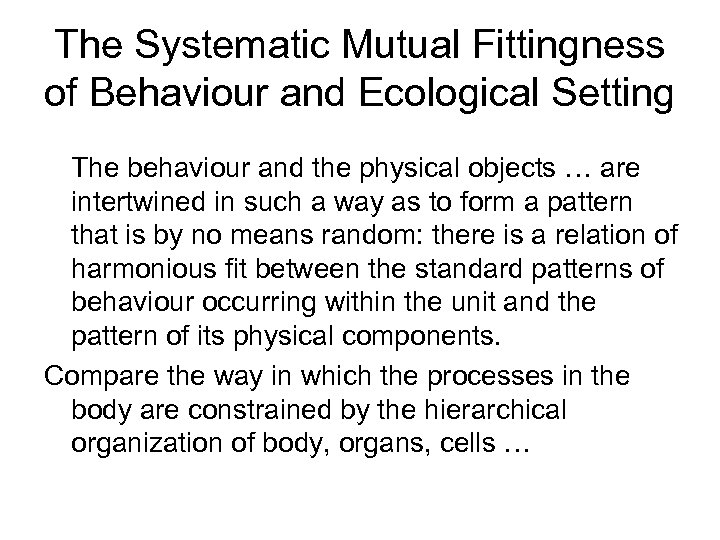 The Systematic Mutual Fittingness of Behaviour and Ecological Setting The behaviour and the physical objects … are intertwined in such a way as to form a pattern that is by no means random: there is a relation of harmonious fit between the standard patterns of behaviour occurring within the unit and the pattern of its physical components. Compare the way in which the processes in the body are constrained by the hierarchical organization of body, organs, cells …