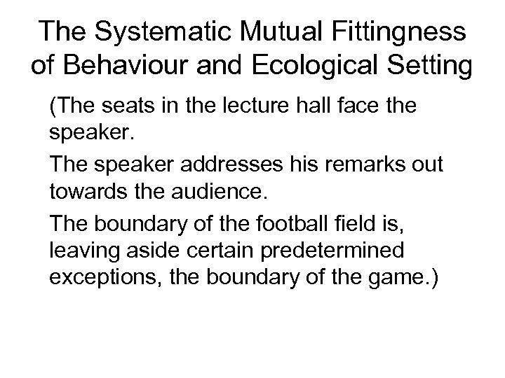 The Systematic Mutual Fittingness of Behaviour and Ecological Setting (The seats in the lecture hall face the speaker. The speaker addresses his remarks out towards the audience. The boundary of the football field is, leaving aside certain predetermined exceptions, the boundary of the game. )