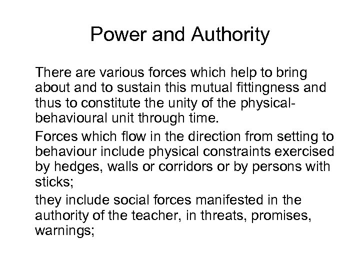 Power and Authority There are various forces which help to bring about and to sustain this mutual fittingness and thus to constitute the unity of the physicalbehavioural unit through time. Forces which flow in the direction from setting to behaviour include physical constraints exercised by hedges, walls or corridors or by persons with sticks; they include social forces manifested in the authority of the teacher, in threats, promises, warnings;