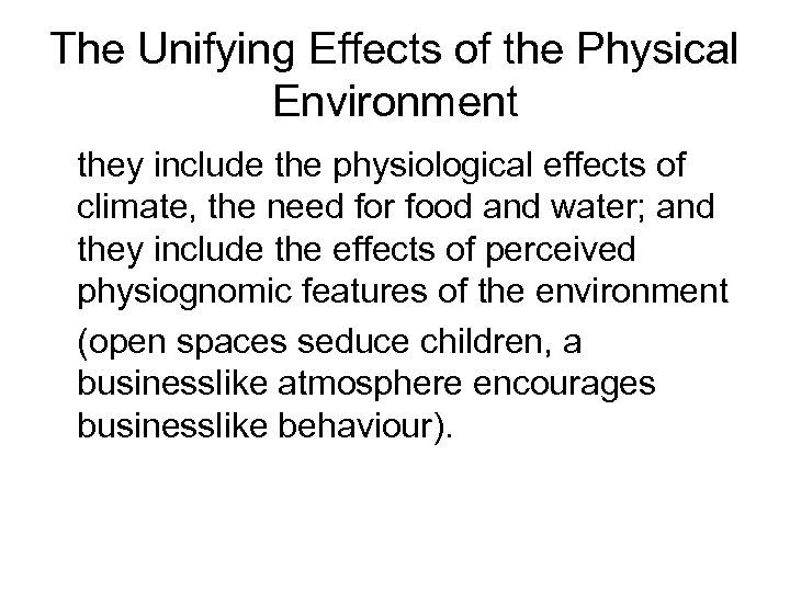 The Unifying Effects of the Physical Environment they include the physiological effects of climate, the need for food and water; and they include the effects of perceived physiognomic features of the environment (open spaces seduce children, a businesslike atmosphere encourages businesslike behaviour).