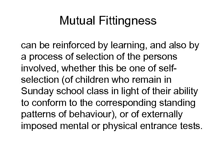Mutual Fittingness can be reinforced by learning, and also by a process of selection of the persons involved, whether this be one of selfselection (of children who remain in Sunday school class in light of their ability to conform to the corresponding standing patterns of behaviour), or of externally imposed mental or physical entrance tests.