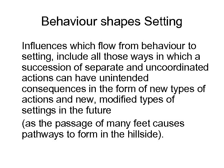 Behaviour shapes Setting Influences which flow from behaviour to setting, include all those ways in which a succession of separate and uncoordinated actions can have unintended consequences in the form of new types of actions and new, modified types of settings in the future (as the passage of many feet causes pathways to form in the hillside).